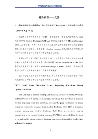 1. 美國商品期貨交易委員會工作人員發布關于 Electricity 二元期權的不行動函