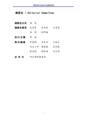 期貨和衍生品行業(yè)監(jiān)管動態(tài) 編委會 | Editorial Committee 編委會主任 楊 光 編委會委員 吳亞軍 巫偉斐 王海智 冉 麗 孫明福 執(zhí) 行 主 編 賈 燕 責 任 編 輯 羅曉穎 劉亭亭 汪琳力 祝文小希 唐源蔚 朱詩薇 張亞楠 韓羽佳 白云婷 合 作 方 中衍律師事務所 3
